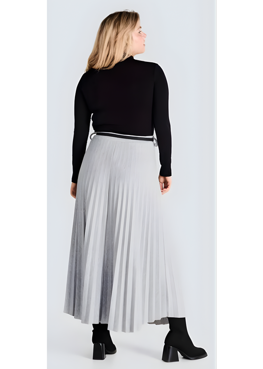 Jessica Laura – Pleated Knit Long Skirt with Faux Leather Belt