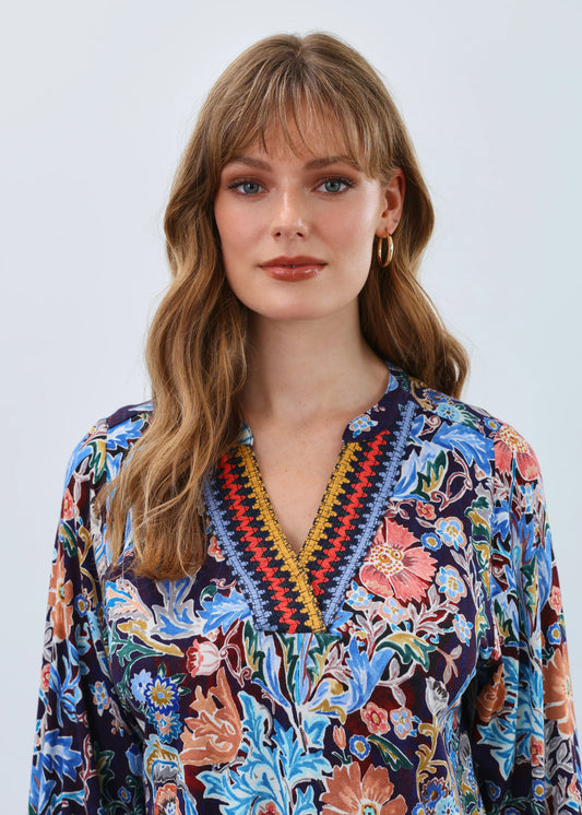 FDJ - 3/4-Sleeve Embellished Neck Top, Damask Watercolour