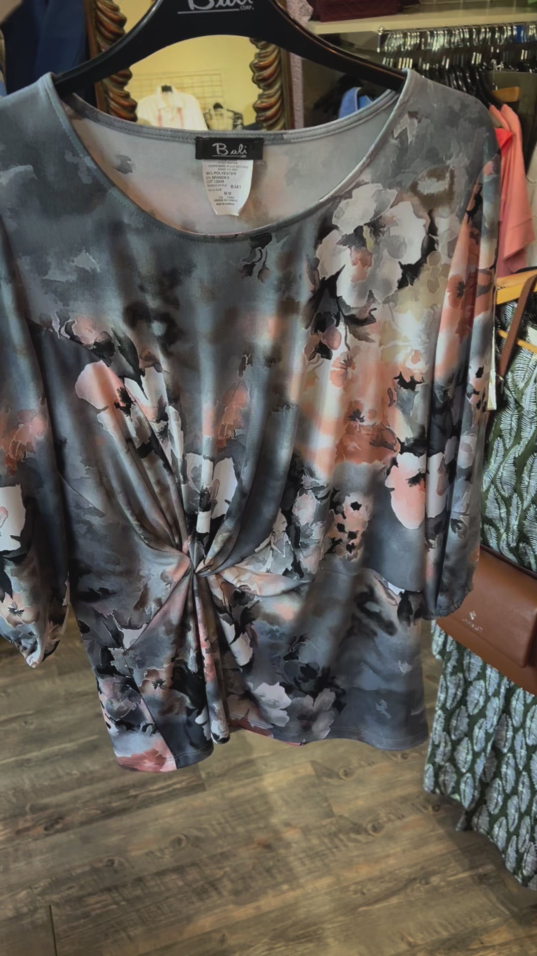 Ajoutez une touche de finesse florale à votre garde-robe avec notre chemise Bali à manches 3/4 élastiques, dotée d'un charmant détail de nœud sur le devant dans un délicat motif floral rose et gris. Cette chemise est le mélange parfait de confort et d'élégance, idéale pour égayer votre look quotidien ou pour vous habiller pour une occasion spéciale.