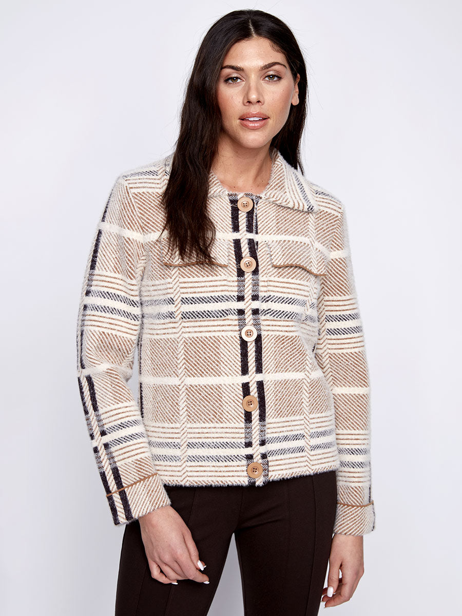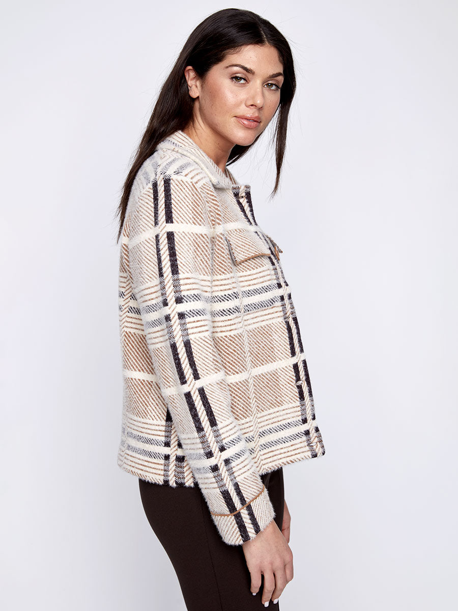 This Coco Y Club brown plaid 'shacket' combines the structure of a jacket with the ease of a shirt, making it a versatile layering piece. Featuring a soft eyelash texture and front patch pockets, it offers both style and practicality, perfect for transitional weather or adding a cozy touch to any outfit.
