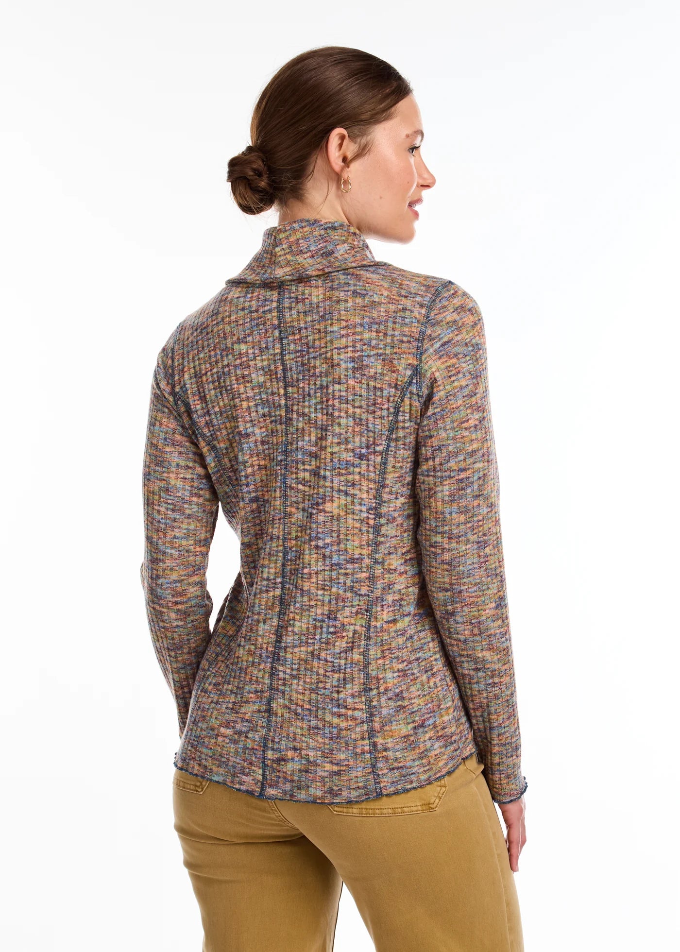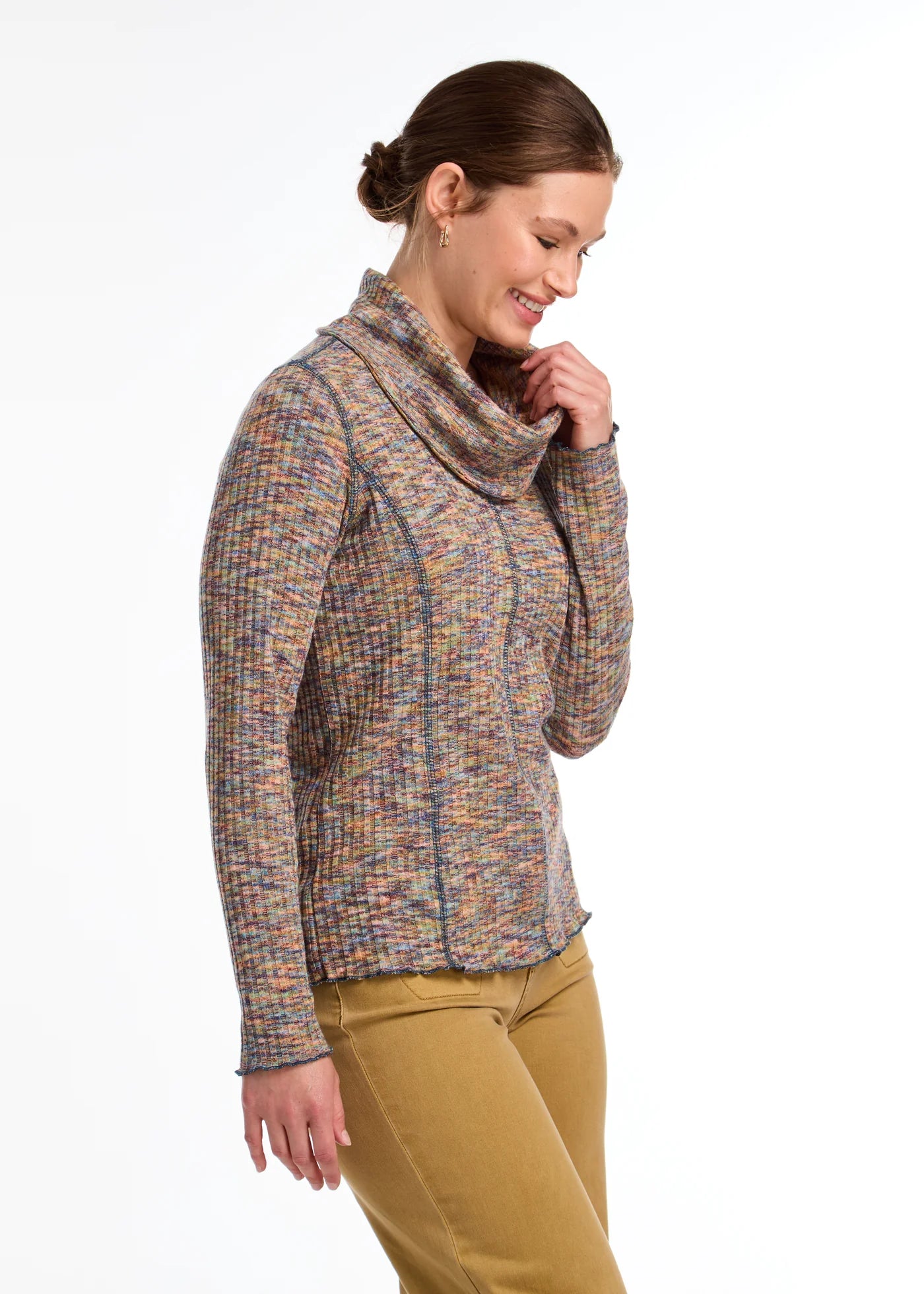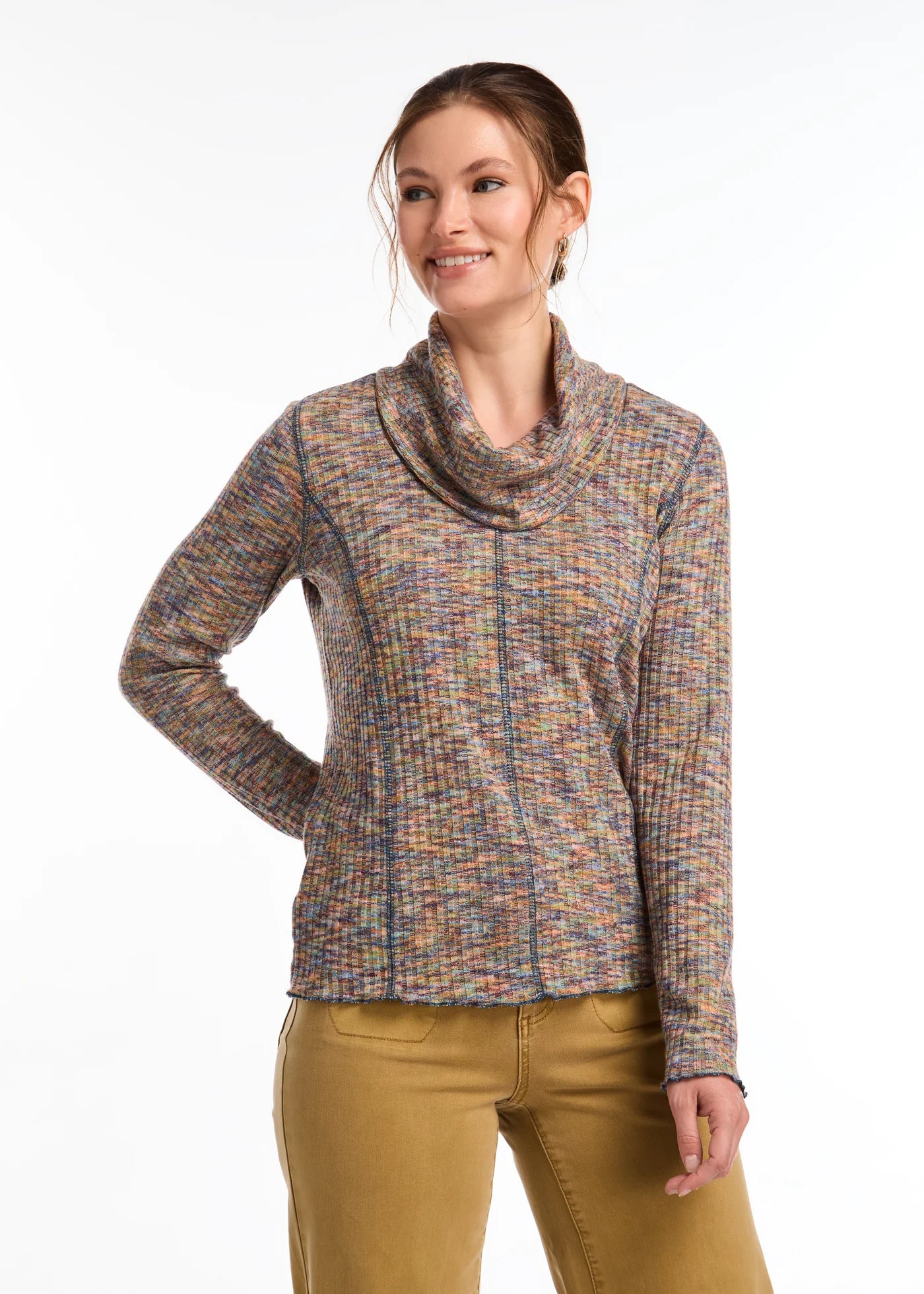 This top boast a multi-colour print and distinct space dye ribbed texture. The lettuce hem adds a playful touch to this vibrant and stylish piece. Made from lightweight material, this long-sleeve top exudes a 90's vibe, making it a fun and trendy choice for fall layering.