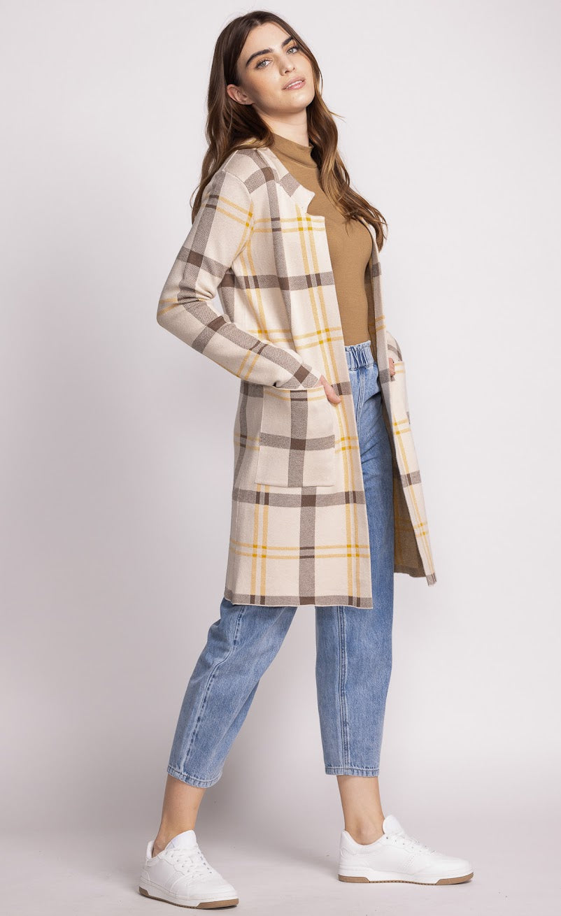 Sophistication at its finest. You'll be the head turner with the Harmon Cardi, featuring a timeless plaid pattern in warm neutral tones that effortlessly complements any wardrobe. Its longline silhouette and cozy fabric make it perfect for layering, adding both comfort and elegance to your look.