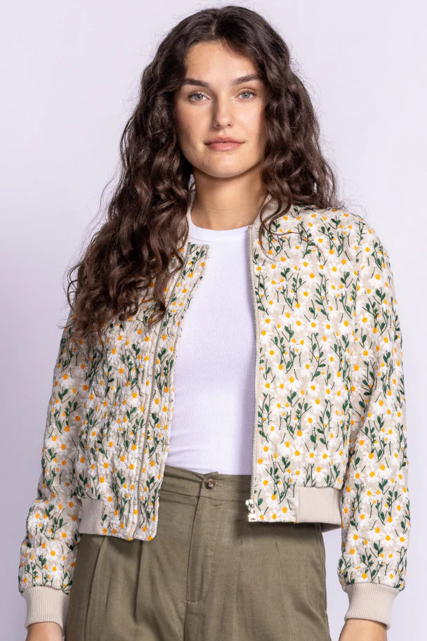 Add a touch of charm to your wardrobe with the Savannah Jacket, featuring a delicate floral print on a quilted cotton design. With a cropped fit, ribbed cuffs, and lightweight feel, this stylish bomber-style jacket is perfect for layering through the seasons.