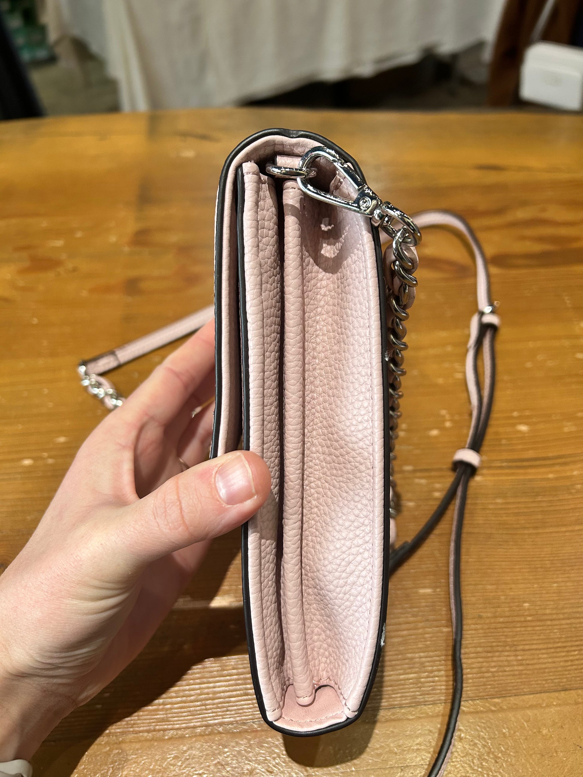 Crafted from pebbled vegan leather, this minimalist bag includes a removable chain strap for versatile wear and a snap-button closure for added security. With its chic dusty pink hue, the Alexa adds a touch of elegance to any outfit.