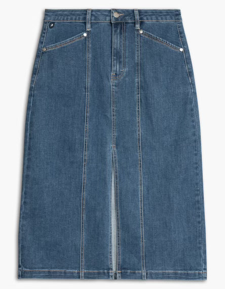 The Alicia denim midi skirt combines classic design with modern comfort. Featuring a stylish front slit and crafted from comfort stretch denim, this skirt offers both mobility and style. The medium denim wash provides a versatile look that pairs well with both casual and dressier tops. Perfect for any season, this skirt is a chic addition to any wardrobe, offering timeless appeal with a contemporary edge.