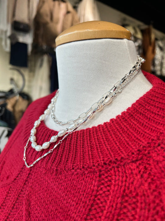 MERX - Triple Chain Silver Pearl Necklace