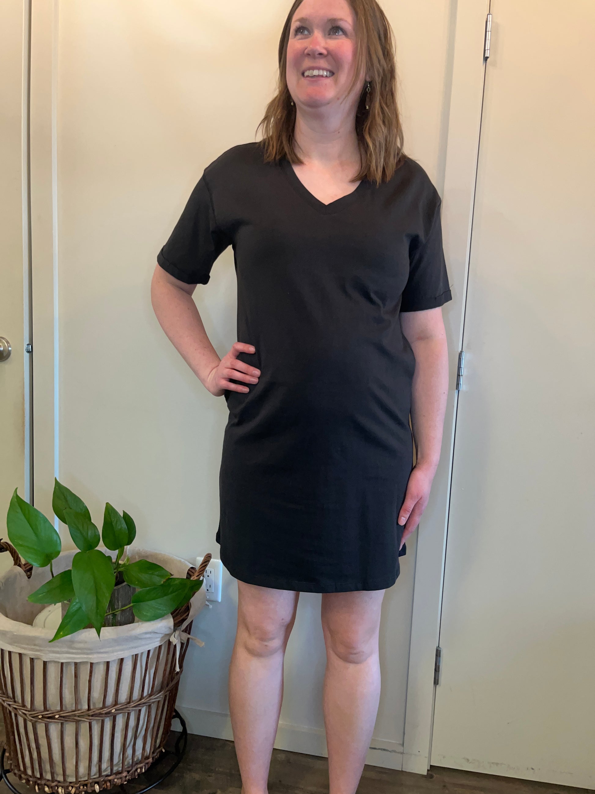 DKR & Co. 黑色棉质 V 领连衣裙完美融合了舒适感和时尚感,是工作或休闲出游的理想之选。这款直筒连衣裙采用 100% 透气棉制成,短袖,为您的日常着装提供时尚解决方案。