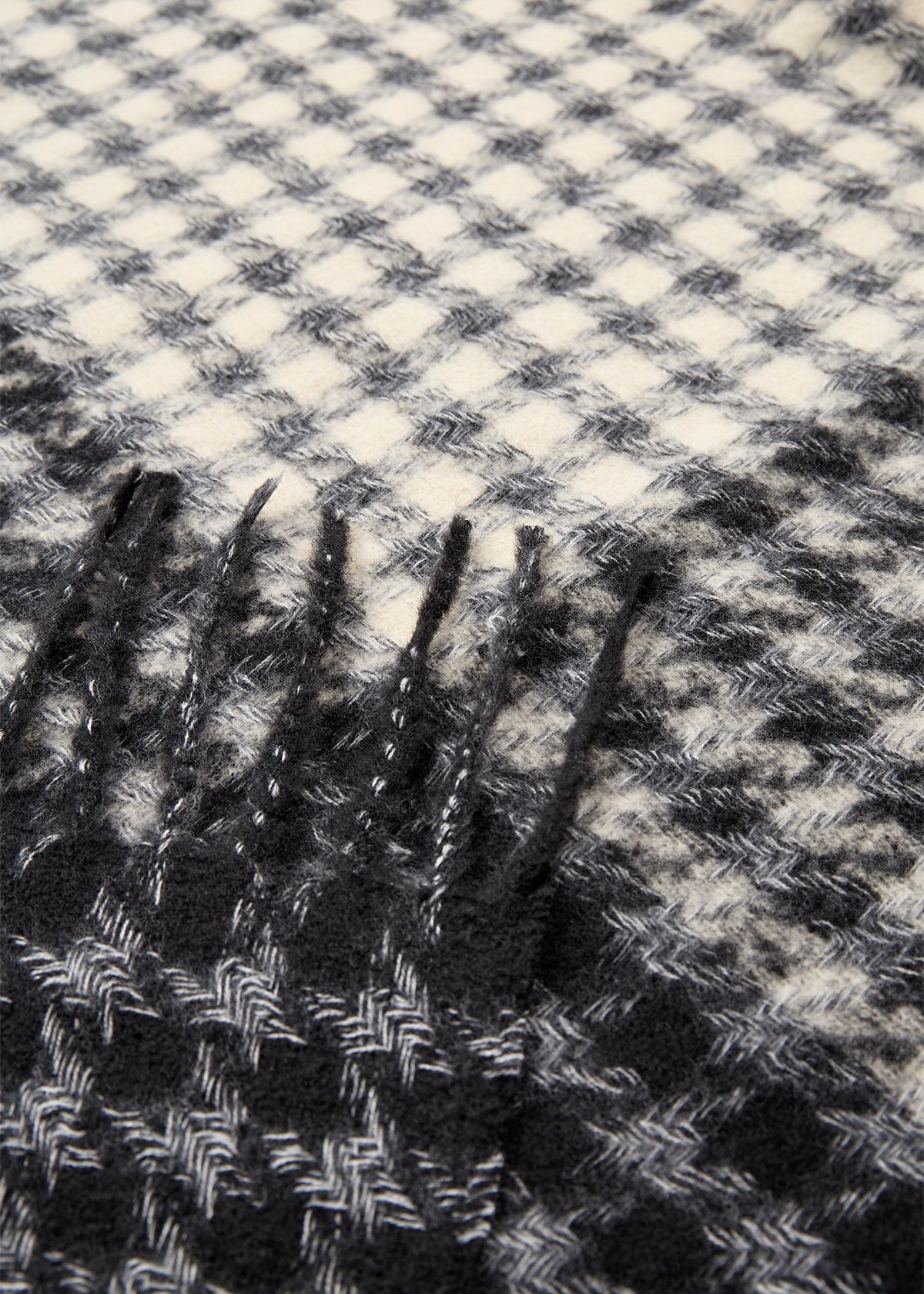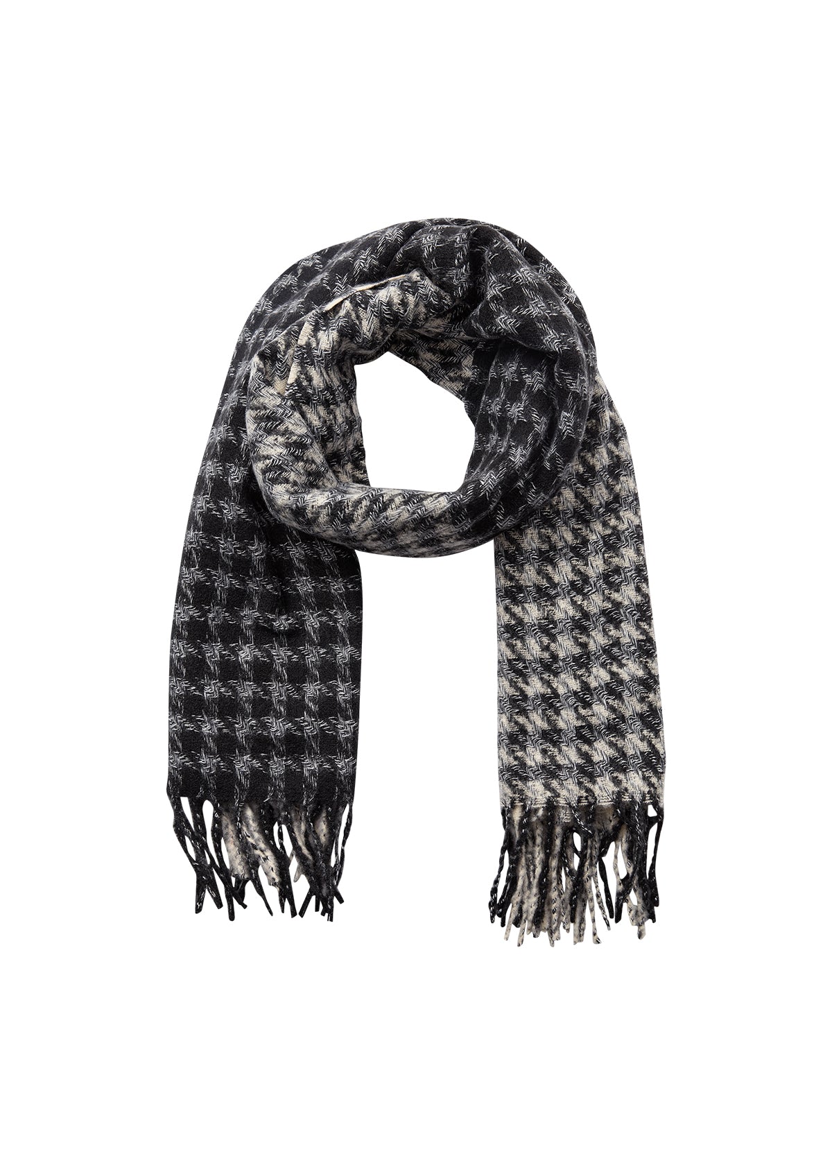 Wrap yourself in timeless style with this chic houndstooth patterned scarf. Featuring a classic black and cream design, this scarf offers a sophisticated touch to any outfit. The soft and cozy fabric provides warmth, while the fringe detailing adds a playful finish. Whether you're heading out for a casual stroll or dressing up for a special occasion, this scarf is a versatile accessory that complements any wardrobe. Style it with your favourite coat or sweater for a polished and effortless look.