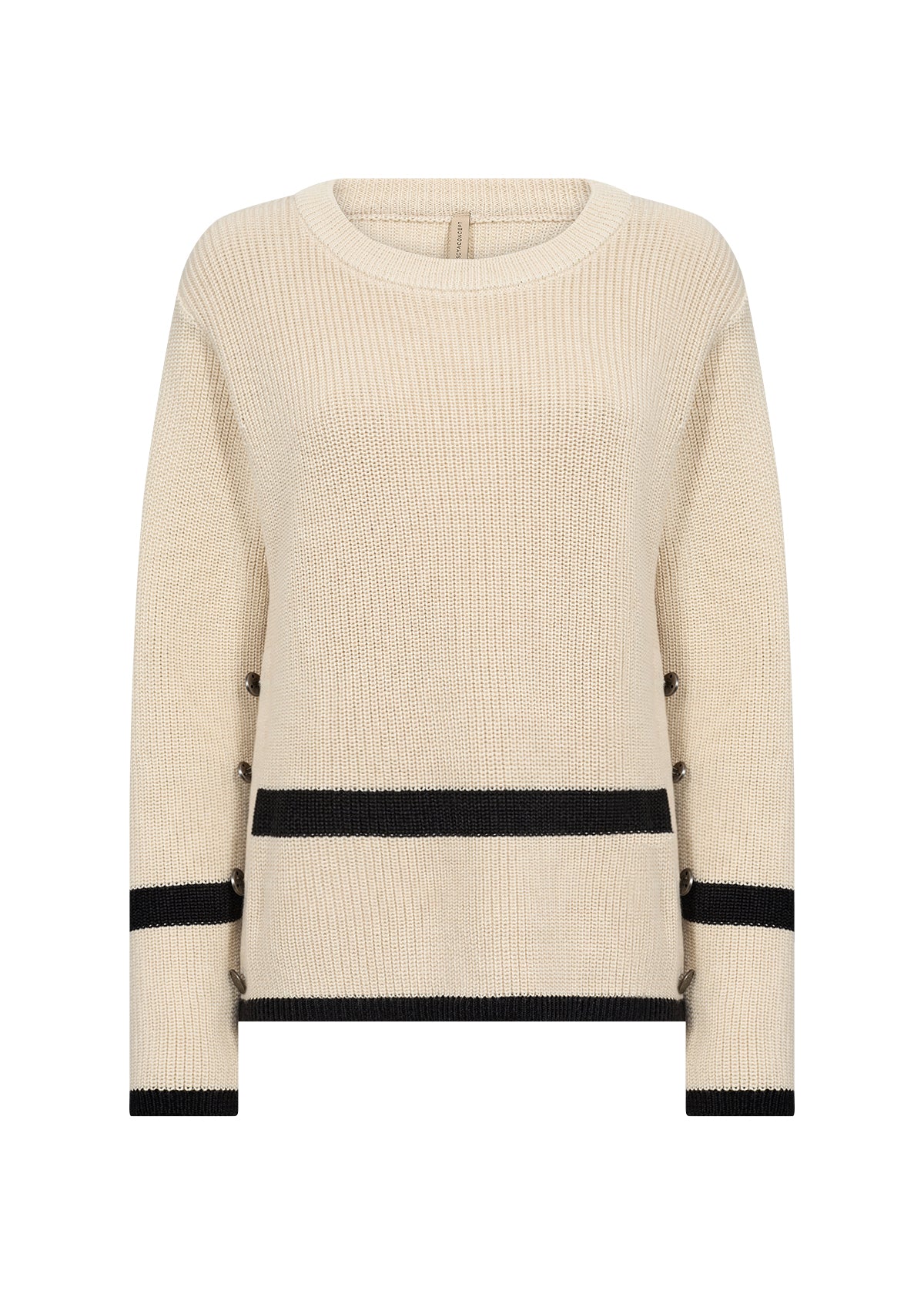 Soya Concept's JULIA 11 is a comfortable pullover crafted from a blend of 50% Cotton, 50% Acrylic. This piece features a blocked knit design, ribbed collar and cuffs, and has side button detailing for added flair. Pair it with tailored trousers or casual denim for a smart look suitable for various occasions.