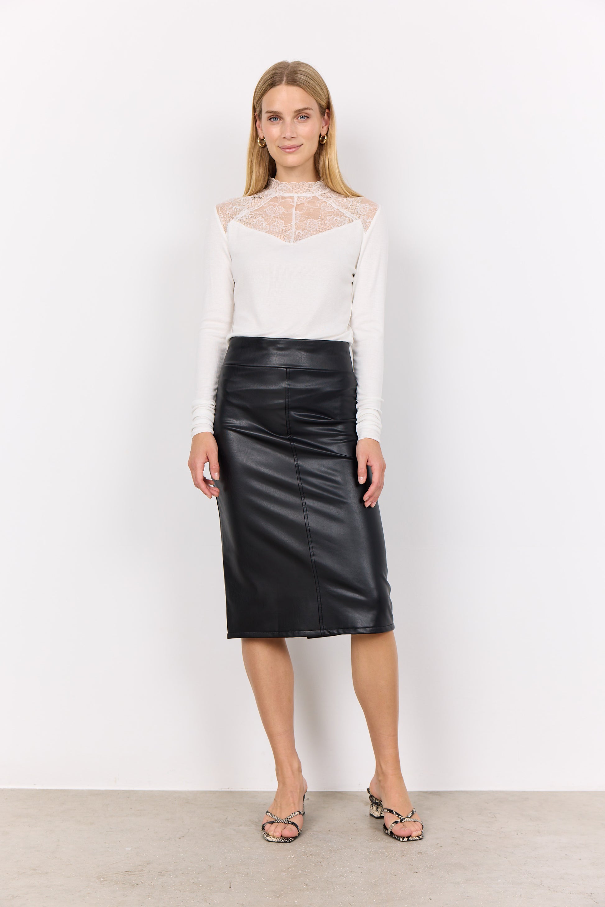 Haida 3 is a feminine PU leather skirt made from 100% polyurethan. The skirt has a high waist, a tight fit and a slit at the front. Style this lovely skirt with some brown boots and a white shirt.
